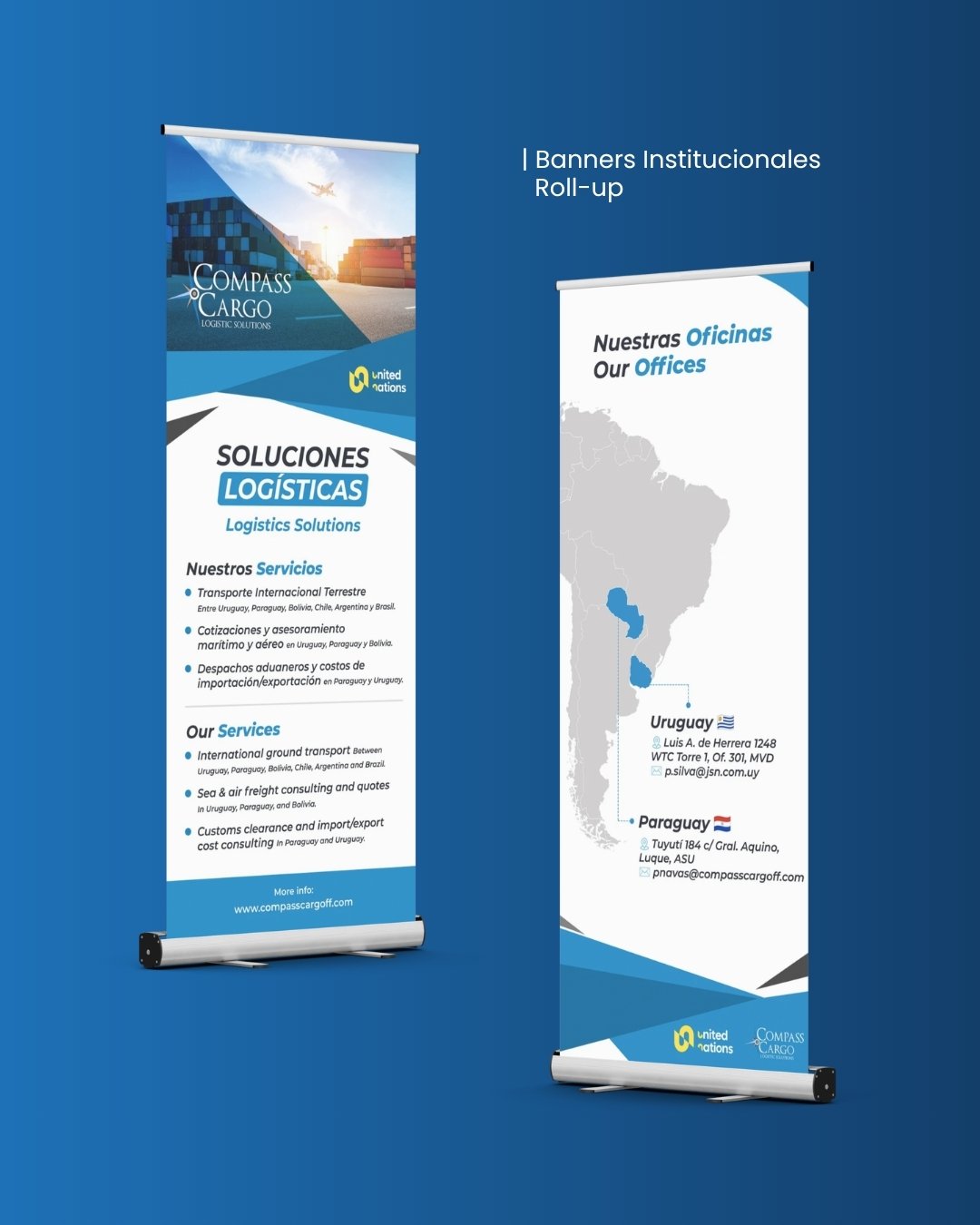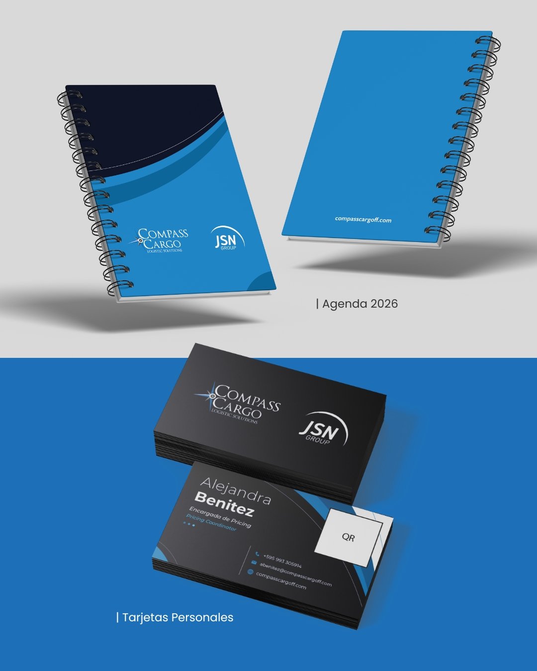 Desarrollo de piezas gráficas institucionales para Compass Cargo en colaboración con Boceto Agencia, enfocadas en reforzar la identidad visual de la marca en distintos soportes.